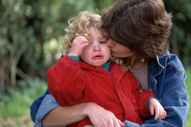 Мальчик или девочка, перестает капризничать, вопросительно смотрит на мать, которая ободряет его: